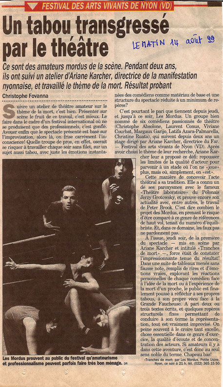 La mort, on en parle seulement lorsqu'on y est obligé, et de préférence avec des synonymes ou des euphémismes. Ainsi, on évoque un décès, on pleure un défunt, on dit de quelqu'un qu'il est parti… Dans une suite de scènes plutôt délirantes, les acteurs en décousent avec leur peur, leurs émotions, leurs jeux de mo(r)ts de mauvais goût et autres fous rires déplacés. Ils tentent aussi de poser quelques questions. Dans ce patchwork tout en chaud/froid, où même la mort a sa minute de cabaret, l'équipe des Mor(t)dus vous emmènent aux confins savoureux de la vie. C'est pour ce spectacle que nous nous sommes choisi un nom de troupe: les Mordus, évidemment.