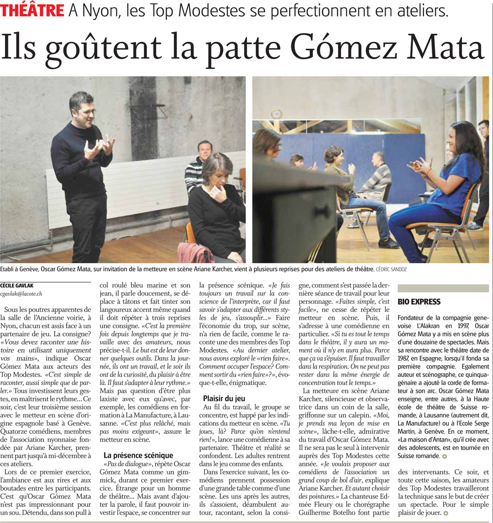 Lors de stages sur toute l'année 2013-2014, de "grosses pointures" comme Guilherme Botelho, Oscar Gomez-Mata, Edmée Fleury, Pascal Auberson, Véronique Clerc, Mickaël Henrotay Delaunay et d'autres encore, viennent à Nyon enseigner qui le mouvement, qui la présence de l'acteur, la voix et le travail du clown. Autant d'outils à découvrir, autant de techniques à perfectionner, de quoi étoffer les compétences.