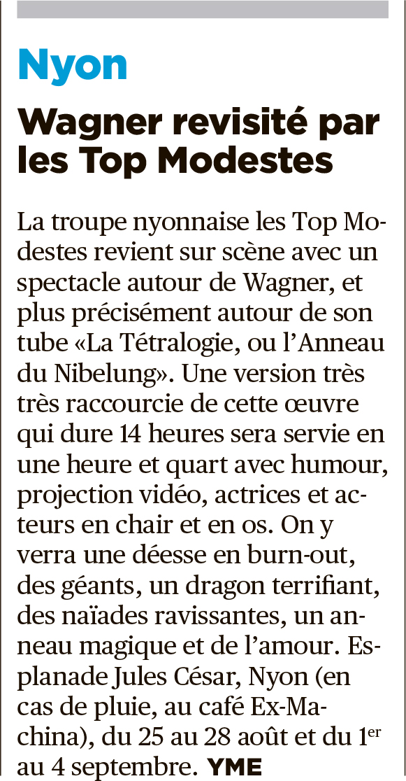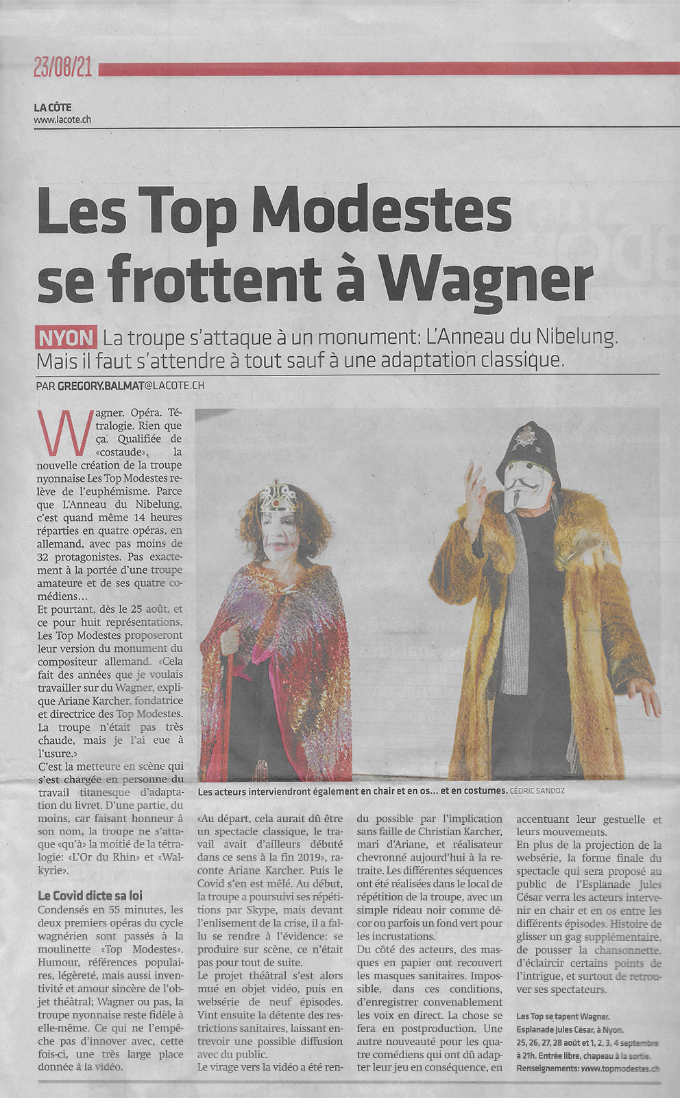 "Humour, références populaires, mais aussi inventivité. Wagner ou pas, la troupe nyonnaise reste fidèle à elle-même. " G.B., La Côte du 20 août 2021. (Lien)